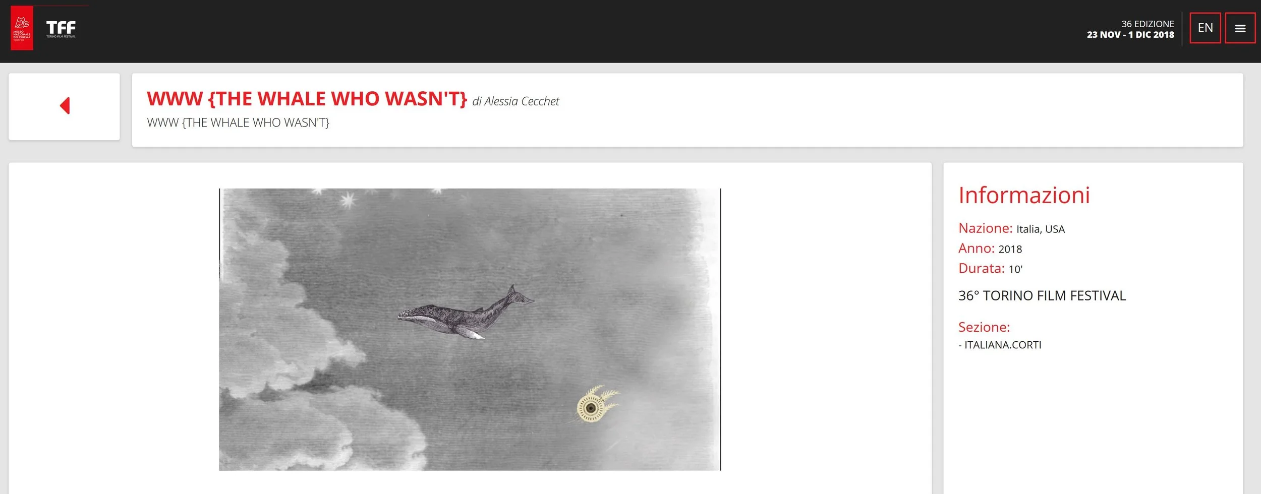For the third year in a row the work of Alessia will be featured at the Torino Film Festival. After screening Onikuma in 2016 and il sentire dell’occhio in 2017, WWW {the whale who wasn’t} will be screened at the 36th edition of the festival this November. We are very exctited about this opportunity to premiere in Italy, thank you Torino FF!